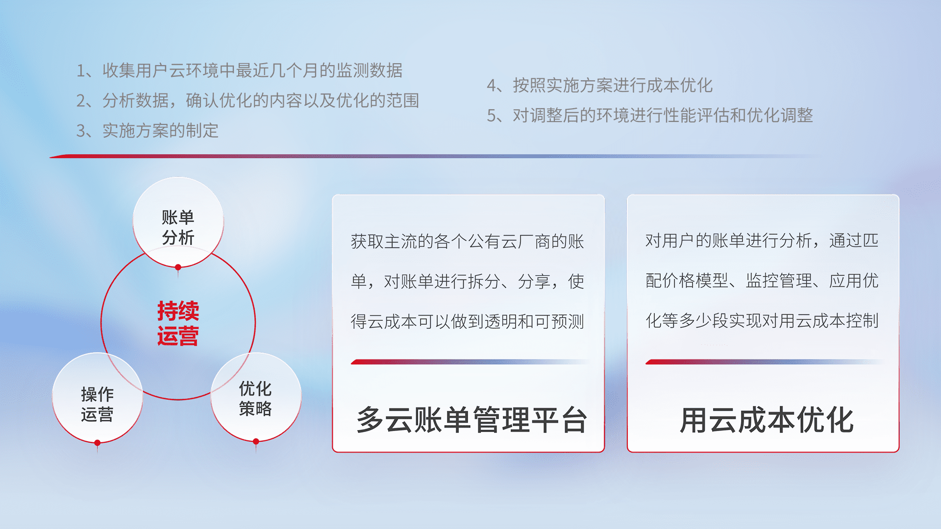 通过多云纳管,,,,以统一的资源数据模型把客户的云资源进行抽象和封装,,,,进而实现对多云资源的统一操作,,,保障云资源管理的可靠性、、、稳定性与可用性。。。量身定制化运维内容,,,配置、、、、开发运维、、、、补丁管理、、备份、、监控、、认证和访问管理、、、审计和日常巡检等,,保障在用云过程中的可靠度,,,稳定度以及高可用率。。