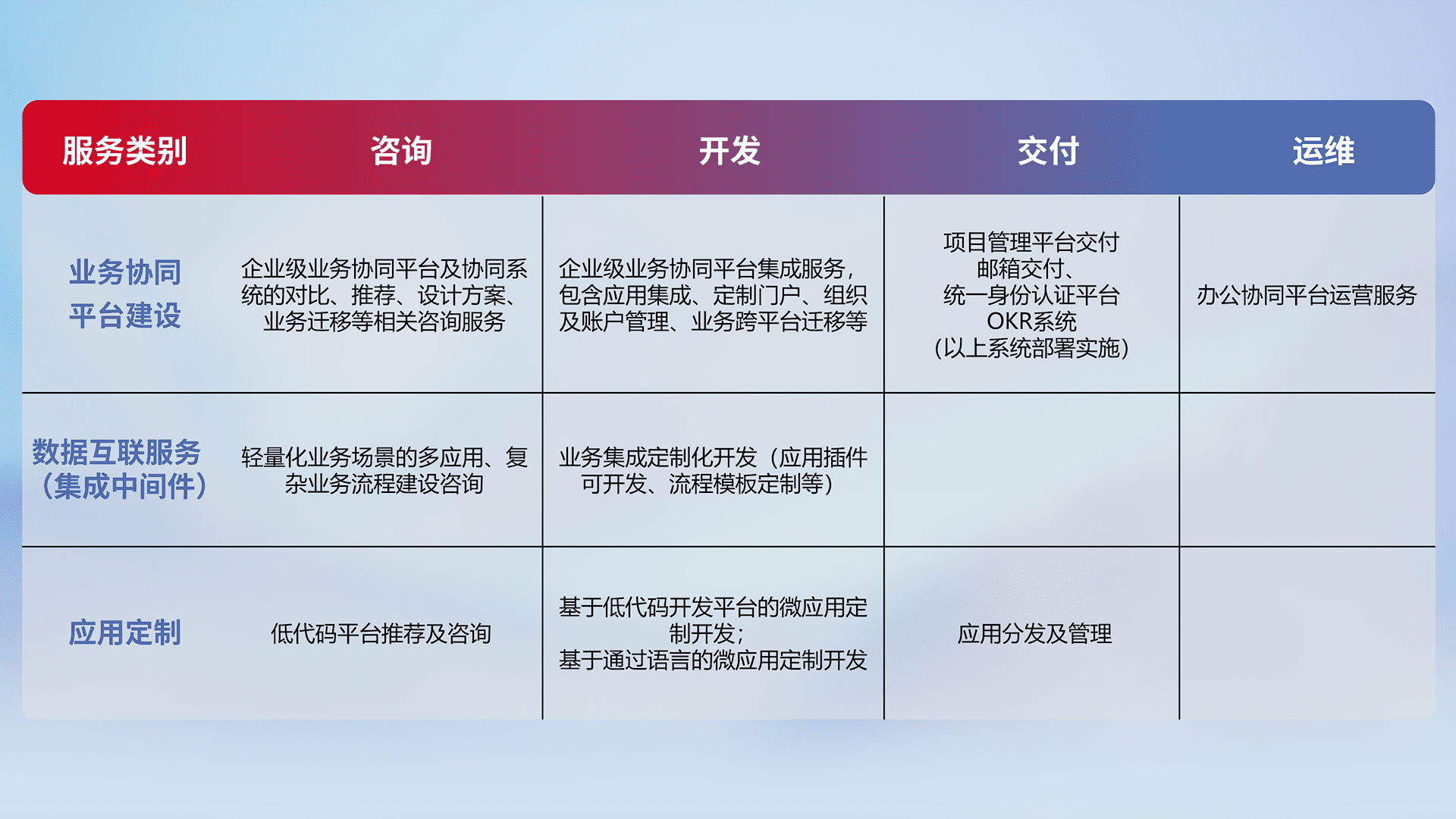 针对钉钉、、、企微、、IDaas等平台级产品提供产品的规划、、、方案、、交付、、、定制化开发等服务,,,,实现如统一协同办公、、、智能客户服务、、混合会议管理、、智能数据查询、、等业务场景,,实现数字化转型。。